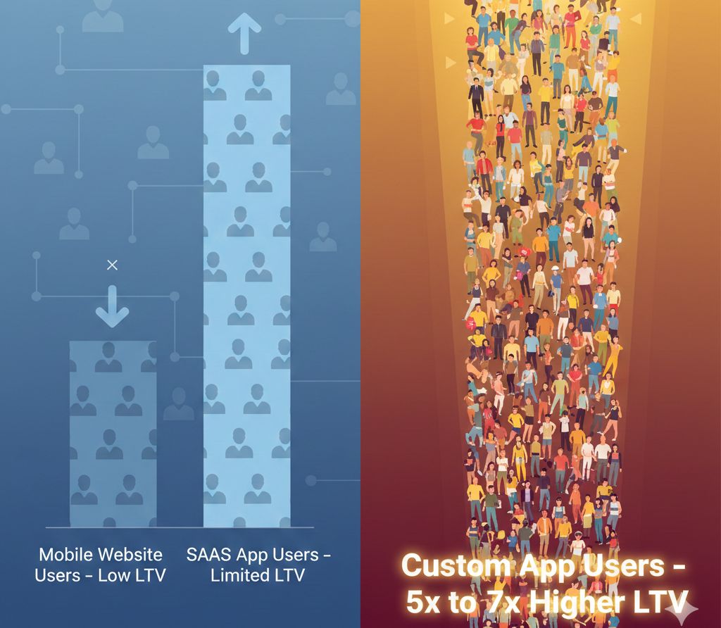 In e-commerce, Customer Lifetime Value (LTV) is the ultimate metric for sustainable success. This is where a custom application moves from a "nice-to-have" to a strategic necessity. The data is striking: mobile app users generate a 5x to 7x higher LTV than mobile website users.