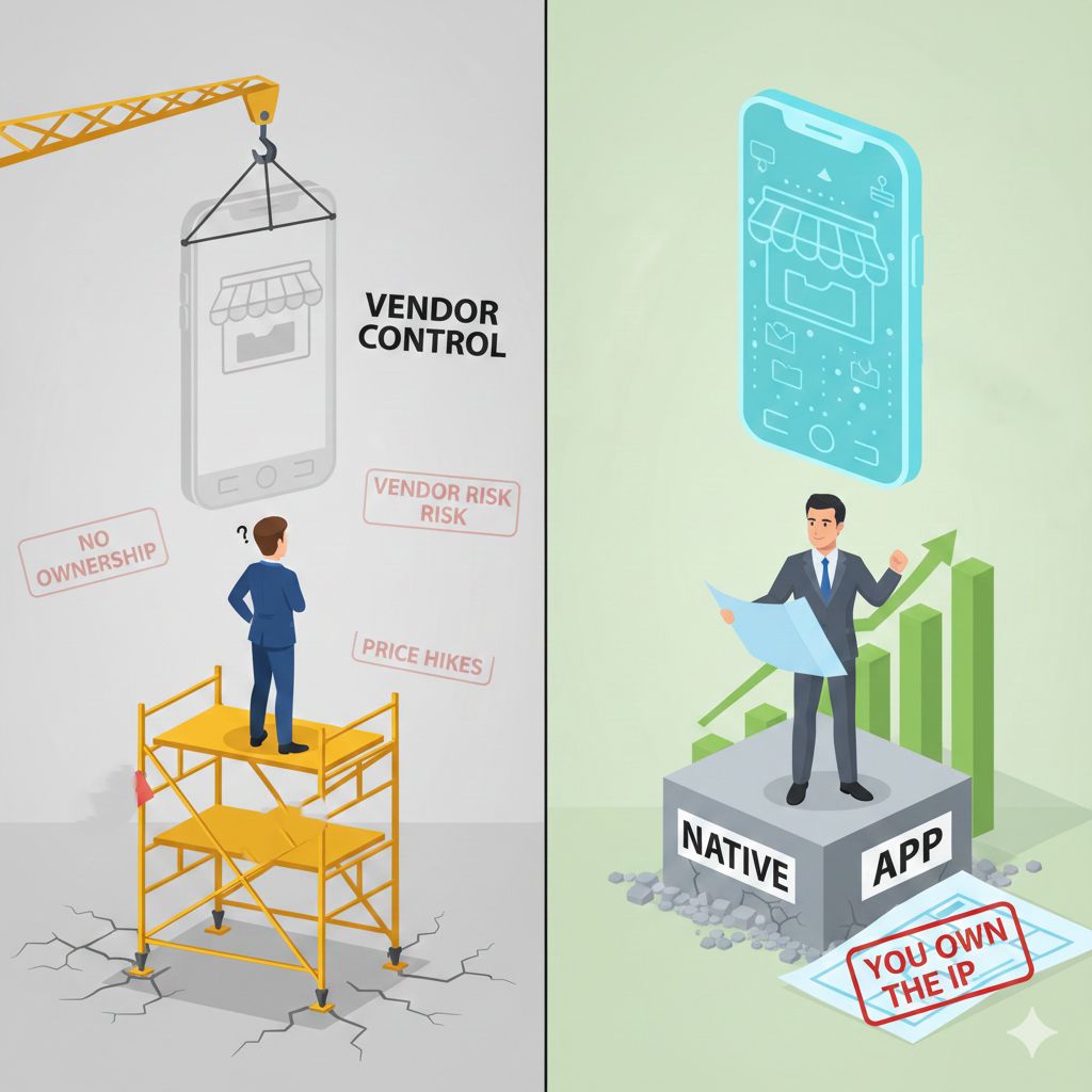 This lack of ownership becomes a major liability. For companies seeking investment or preparing for an acquisition (M&A), owning core technology is a massive factor in company valuation. During due diligence, reliance on a third-party, licensed framework is a major red flag that can lead to a substantial discount on your company's valuation. Furthermore, it exposes you to vendor risk: arbitrary price increases, platform failure, or acquisition could jeopardize your mobile channel with no recourse.