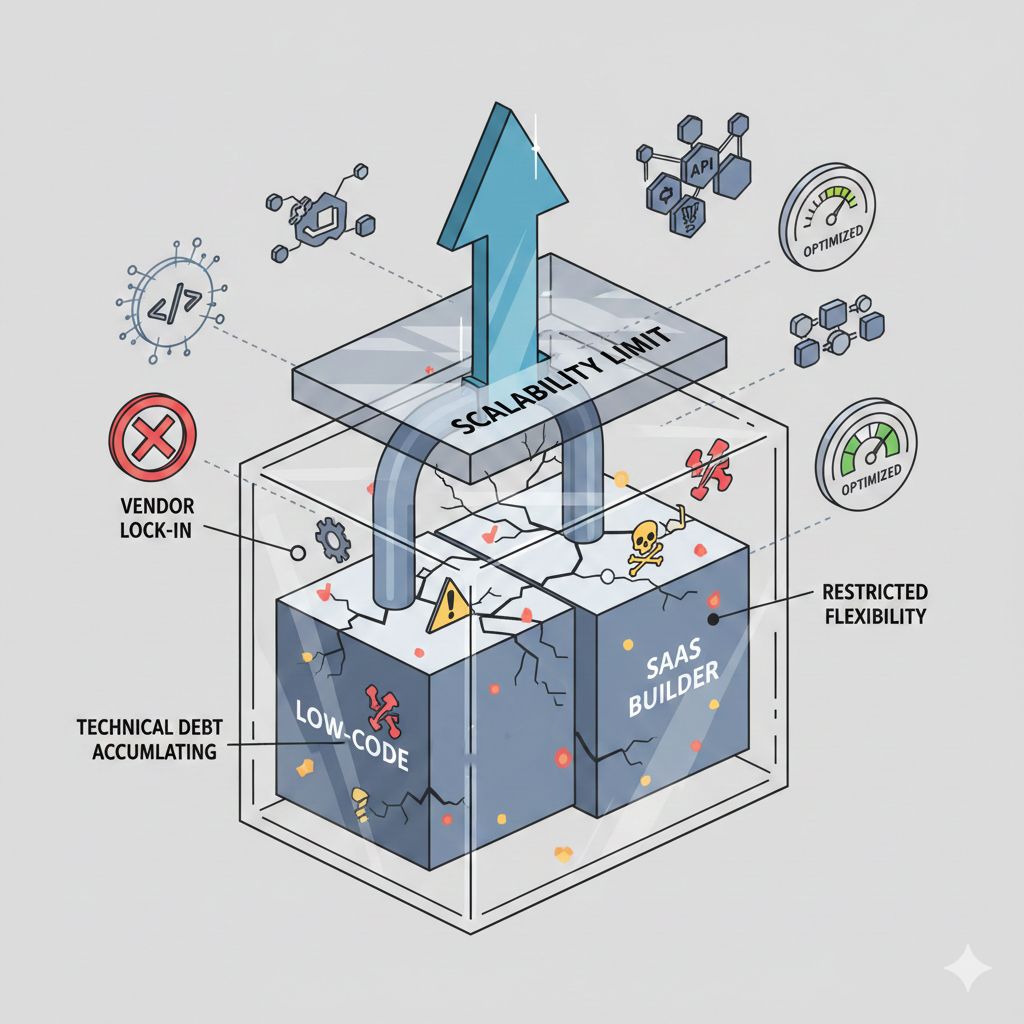 SaaS builders create vendor lock-in through proprietary, low-code systems that inherently accumulate technical debt, which compromises future flexibility and robustness. As your business scales, you will inevitably hit a "scalability ceiling" where you need unique features, better performance, or complex integrations that the builder cannot support.
