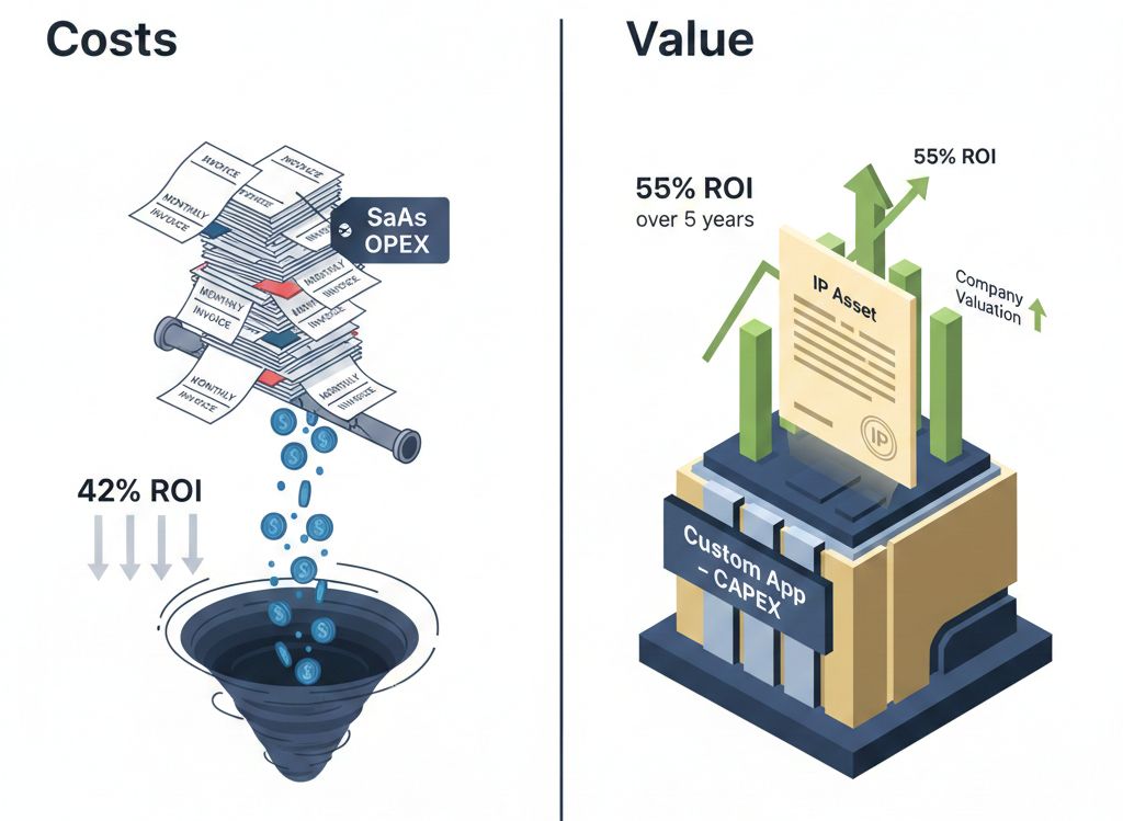 In contrast to the recurring OPEX of a SaaS subscription, a custom-built app is a Capital Expenditure (CAPEX) that your business owns completely. This proprietary software becomes intellectual property (IP) that acts as a valuation multiplier, directly enhancing your company's worth during funding rounds or an acquisition. The financial returns reflect this fundamental difference. Custom solutions report an average Return on Investment (ROI) of 55% over five years, significantly higher than the 42% average for SaaS implementations.